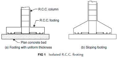 (i) Isolated Column Footings: If separate footings are provided for each column, it is called isolated column footing. Figure 1 shows a typical isolated column footing. The size of footing is based on the area required to distribute the load of the columns safely over the soil . These footings are provided over a 100 to 150 mm bed concrete. Required reinforcements and thickness of footing are found by the design engineers. Thickness may be uniform or varying.